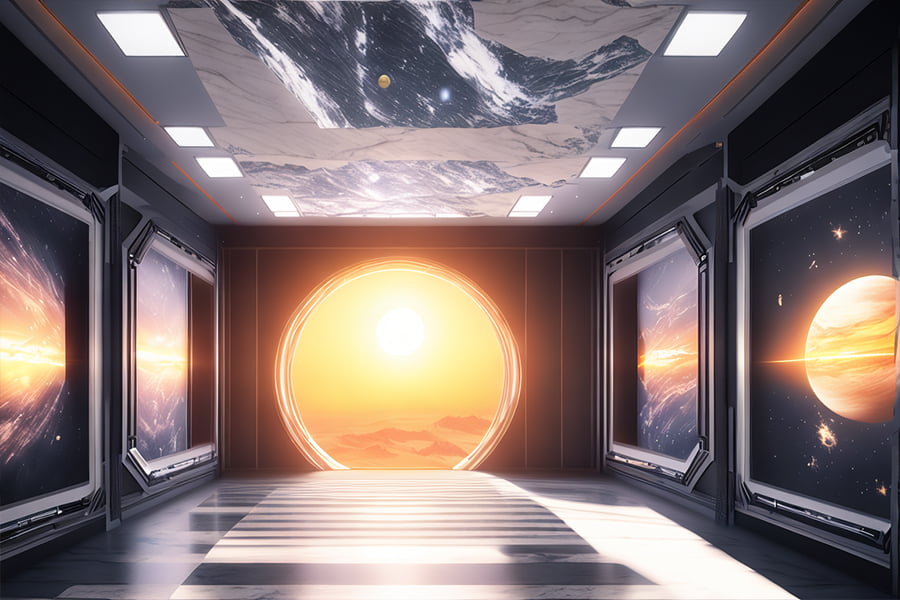 這個(gè)區(qū)域是天文科普館的入口,它將以宏大的設(shè)計(jì)元素迎接您,如一扇星際迷航之門(mén)。這個(gè)門(mén)的設(shè)計(jì)靈感來(lái)源于宇宙飛船的形狀,光滑的金屬質(zhì)感與星際之旅的冒險(xiǎn)氛圍相得益彰。燈光將以藍(lán)色和紫色為主,猶如星空中的繁星閃爍。多媒體設(shè)備將播放星際飛行的震撼畫(huà)面,展板上展示著星際迷航的歷史,雕塑則呈現(xiàn)著星際飛船的精巧細(xì)節(jié)。